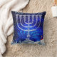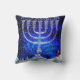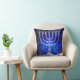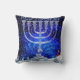 Blue-and-white-based winter design with menorah, hannukah-elf, snow, christmas-trees and "Happy Hannukah" in Hebrew, throw-cushion/pillow