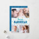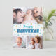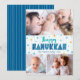 “Happy Hanukkah.” Fun, playful, whimsical handcrafted typography along with a random Star of David pattern in light blue and faux gold foil, all overlaying light aqua blue hand drawn lines on a white background, along with 3 photos of your choice, help you usher in Hanukkah. Hand drawn turquoise lines overlay a navy blue background on the back. Feel the warmth and joy of the holiday season whenever you send this stunning, colourful, personalised Hanukkah greeting card. Matching stickers, pillows, wrapping paper, serving trays, home décor, and more are also available. Make this Hanukkah one to remember!