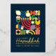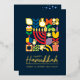 Happy Hanukkah / Chanukah Modern Geometric Holiday Greetings in Real Gold Foil on Dark Navy. Menorah, Dreidel, Doughnuts, Stars & Olive oil... They are all here. Jewish Hanukkah Symbols + Space to add your personalised text on the front & reverse. Hebrew on the reverse says, "Chanukah Sameach" — Happy Hanukkah. This upscale, beautiful, look, is a great way to wish friends, family, and clients, a very Happy Hanukkah / Chanukah.