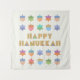 A festive geometric Happy Hanukkah design with colourful dreidels and stars. A modern, non-traditional design with stylised dreidels and Star of David shapes.