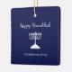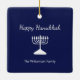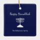 Happy Hanukkah Blue Holiday ornament, with a simple white menorah and script typography design. With white customisable lettering, you can add your own information. A festive addition to your holiday decor.
