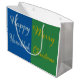 Inclusive blue and green design with gold and silver lettering—perfect for mixed holiday celebrations. Office party holiday supplies, hospital party, senior center holiday party. Happy Hanukkah and Merry Christmas design. Great gift bags for gifting to those who celebrate both Hanukkah and Christmas.