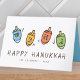 Design is composed of Dreidel spinning top illustration. Add your name, greeting, and year