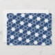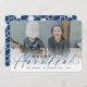 A simple and modern holiday card featuring a full bleed photo and 'Happy Hanukkah' greeting in a trendy dark navy blue calligraphy handwriting script at the bottom on a white gradient photo overlay. A geometric star of david white pattern on a neutral taupe background fills the back of the card.
