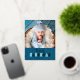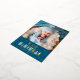 “Happy Hanukkah.” Fun, playful, whimsical handcrafted real gold foil and light blue typography, a random gold foil Star of David pattern, and midnight navy blue hand drawn lines overlay a dark teal blue background. Add the photo of your choice and help usher in Hanukkah with this stunning, colourful, personalised real gold foil greeting postcard. Your custom note, typed or handwritten, is on the back. Feel the warmth and joy of the holidays whenever you send this festive greeting. Your choice of gold, silver, or rose gold real foil. Matching envelopes, stickers, tote bags, wrapping paper, serving trays, home décor, and more are also available. Send this to someone special!