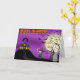 Happy Haunting Reaper Greeting Card features Haunted Halloween night scene with a gradient purple sky, yellow glowing moon behind a spooky tree silhouette & bats flying around. The rest of the scene features a grim reaper with a bloody sickle and a black cat wearing a witches hat next to a gravestone. Colourful Stylised is Happy Haunting. Inside card : Has a yellow glowing moon behind a spooky tree silhouette and a grim reaper with a bloody sickle. Inside text reads; Wishing you a Happy Halloween. Conveniently with an envelope. Available on Note Card size. Matches our Invitations, Postage and address labels.