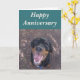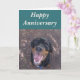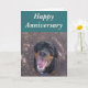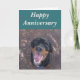 The message on this card says, "Happy Anniversary! No one makes me smile the way that you do!" This anniversary card shows an image of a Rottweiler puppy named Heidi. Heidi is smiling from ear to ear with her mouth open and her bright white puppy teeth showing. An irresistible anniversary card for everyone.