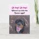 The message on this funny Easter card says, "Oh boy! Oh boy! Where'd ya hide the Easter eggs?" Along with wishing you a "Happy Easter," there are little paw prints, "sniffs," and "woofs" as Heidi searches and finds three hidden Easter eggs on the inside of this card. This Easter card features our adorable Rottweiler puppy, Heidi, as she sits happily with her mouth open in a big toothy smile. An Easter card perfect for everyone.