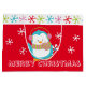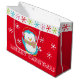 This happy little penguin is featured on this shopping bag. He's ready for the holiday season with his striped scarf, pink earmuffs and candy cane. The red background has is sprinkled with white snowflakes. The white band wraps around the top of the bag along with colourful snowflakes. The text on the bottom can be customised.
