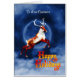 A cheerful happy holidays card showing a reindeer flying through the clouds and past the moon. A good card for a business to send.
