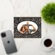 Happy Holidays Christmas Photo Woodland Doodle Foil Holiday Postcard Foil Christmas Postcard features your favourite photo surrounded by cute woodland animals and winter floral elements and all tied together with a whimsical coquette bow with the text "Wishing you a happy holiday" in modern typography on a dark grey background and personalised with your family name. On the reverse add your custom message. Perfect for family and friends for Christmas and the holidays. Created by Evco Studio www.zazzle.com/store/evcostudio