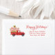Cute little pigs all dressed up for Christmas in the back of a vintage red pickup truck. Happy Holidays in an ornate handwritten calligraphy text. Personalise with your own name and address.