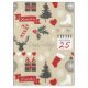 Seamless Happy Holidays design Christmas symbols - snowflakes, deer, calendar, Christmas tree, Christmas gift, skate, hearts, Christmas ornament, Christmas stocking, ribbon - decoration on grey background
