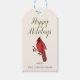 Cute custom Happy Holidays gift tag featuring a cardinal on a beige background. The message, as well as the font style, size and colour can be changed by clicking on "customise further".