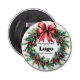 Custom "Happy Holidays" bottle opener for clients personalized with your business logo, a festive wreath, and an elegant red bow. Company promotional supplies for the Holidays, you can order in bulk for your employees or as branding and marketing supplies to promote your store to customers.