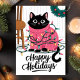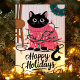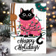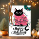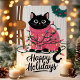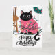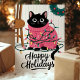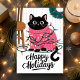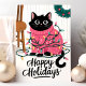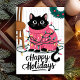 This adorable holiday card features a black cat tangled in colourful Christmas lights while wearing a pink festive sweater. Perfect for any cat lover, this cute and playful card is an excellent way to send warm holiday wishes. The illustration captures the joy and fun of the holiday season, making it a delightful choice for animal lovers and festive greetings alike.