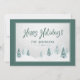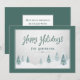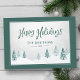 Elegant country holiday flat cards with "Happy Holidays" in handwritten style calligraphy along with your personalised family name or names and the year in a blue spruce pine coloured, rustic style typography. An artistic scenic view of trees and winter snow highlights the front of the card accented in a pleasant, pine green frame. The back of the card, also in pine green, features a text space for your personal holiday message or can be left blank for you to handwrite one if needed. Available in high quality printed card stock for standard mailing or a downloadable, digital format for quick and easy sending via text message, email or even self print.