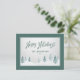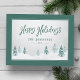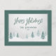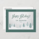 Elegant country holiday Postcards with "Happy Holidays" in handwritten style calligraphy along with your personalised family name or names and the year in a blue spruce pine coloured, rustic style typography. An artistic scenic view of trees and winter snow highlights the front of the card accented in a pleasant, pine green frame.