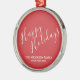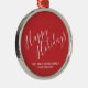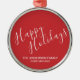 Red and White Modern Holiday Ornament featuring title 'Happy Holidays' in white modern script font style with family name in white modern sans serif font style on red background.