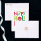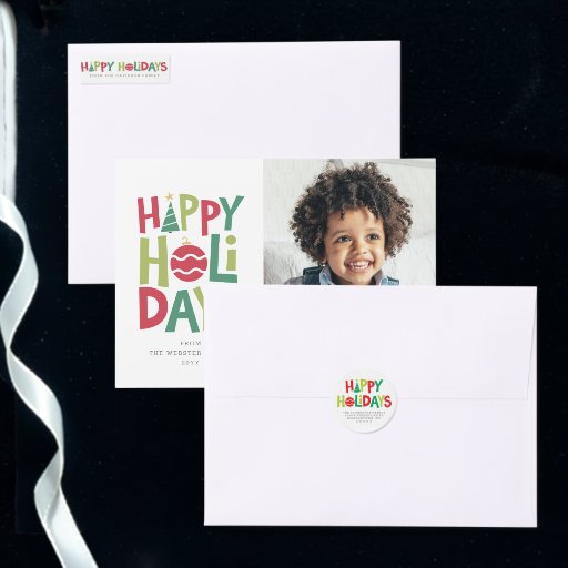 Send merry and bright holiday wishes with this colourful card featuring fun and playful illustrations as part of the word "happy holidays." Inside has a place for personalised greeting and name, but can also be left blank.