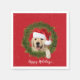 Cute golden retriever in Christmas pine wreath on red with snowflakes and Santa cap.