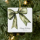 This Happy Holidays Green Watercolor Bow Christmas Ceramic Ornament captures a sophisticated and modern holiday charm. The front side features an olive-green watercolor bow delicately illustrated in the upper corner, with "Happy Holidays" in an elegant script at the bottom, accompanied by a personalised name in a simple, stylish font. Set against a clean white background, this ornament adds a chic and heartfelt touch to holiday decor, perfect for gifting to loved ones or treating yourself to a festive keepsake. Keywords: typography, for her, xmas, modern, minimalist, elegant, sophisticated, personalised, custom, girly, cute, stylish. Adorn your tree or gift this timeless ornament to someone special, adding a lovely, personalised touch to the season. Click "Personalise this template" to add a unique name for a one-of-a-kind holiday memento.
