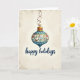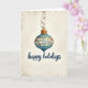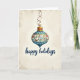 On this holiday card 🎅🏼🎄🎁, you'll see a stunning ornament in the middle. It's detailed with lots of designs and it shines in gold at the top. Three ribbons swirl up in red, gold, and green colors for a fun look. The ornament sits on a warm background that looks like old paper. Around it, there are green swirls, red flowers, and yellow petals, all painted by hand to look real. Under the ornament, it says "happy holidays" in dark blue letters that look fancy. The card feels like a cherished old treasure and brings a cozy, festive feeling. It's perfect for spreading holiday cheer and joy to your friends and family. 🎅🏼🎄🎁