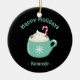 This adorable holiday ornament features a pastel blue cup filled with cosy hot chocolate, topped with a festive candy cane. The cheerful phrase “Happy Holidays” adds seasonal charm, while the option to personalise with a name makes it a thoughtful and unique gift. With its soft colours and sweet details, this design is perfect for winter celebrations, stocking stuffers, or spreading warm holiday vibes.