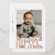 A charming and festive holiday design featuring a full-photo front framed by clean white borders and elevated with shimmering foil accents. The bold “Happy Holidays” greeting sparkles with metallic detail, including a small ornament motif that adds a warm seasonal touch. The foil color can be customized in any of the three available options, allowing you to match your preferred holiday palette. Crisp, modern typography pairs beautifully with the metallic finish, creating a polished look perfect for baby portraits, family photos, or holiday snapshots. The back includes two additional photo spaces and a personalized holiday message, offering a stylish and heartfelt way to share your greetings.