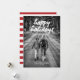 Happy holidays photo card featuring the words "happy holidays", in white, bold typeface font overlay, and black and white picture template with two girls walking on path. The back of these 2014 5x7 flat photo Christmas cards feature a festive red and white horizontal stripes pattern.