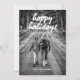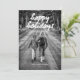Happy holidays photo card featuring the words "happy holidays", in white, bold typeface font overlay, and black and white picture template with two girls walking on path. The back of these 2014 5x7 flat photo Christmas cards feature a festive red and white horizontal stripes pattern.