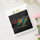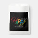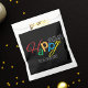 Make your holiday gifts and party favours truly memorable with these eye-catching colourful favour bags. This design beautifully blends a fun, handwritten script with a clean, modern aesthetic. The word "Happy" is a burst of colour—a vibrant mix of red, green, blue, yellow, and orange—creating a truly festive look that pops against the sleek black background panel. The word "HOLIDAYS" is presented in a crisp, white, all-caps font for a perfect contrast.