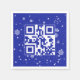 Blue and white QR Code reading Happy Holidays on a blue background with scattered snowflakes.