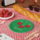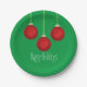 A festive holiday design with three bright red ornaments set on a green background. Text and background colour can be customised.