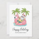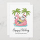 Get into the holiday spirit with this fun and whimsical card featuring a cartoon Santa Claus relaxing in a pink flamingo floaty. Dressed in a festive Hawaiian shirt, red shorts, and his classic Santa hat, this laid-back Santa adds a playful twist to your holiday greetings. The floaty bobs in soft teal blue water, bringing a sunny, lighthearted feel to the design. A couple of green palm trees in the back.