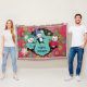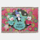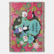 Beautiful Christmas holiday throw blanket features three adorable penguins in ice skates, sweaters, striped scarves, and winter hats on a background of hot pink with orb snowflakes, a black with white dots and white snowflakes, and a blue star centre. You can easily personalise with text that reads Happy Holidays, Merry Christmas, or your family name!
