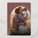Our festive and elegant holiday card design with a unique arched layout is the perfect way to show off your favourite vertical or portrait orientated family photo. Design features "Happy Holidays" in shining gold foil typography and hand lettered script, with your family name curved over the top of the photo. Cards reverse to a white winter snowflake pattern.