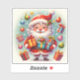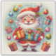 A cheerful Santa Claus holds colourful presents adorned with ribbons, surrounded by twinkling ornaments and falling snowflakes.