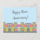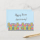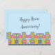 Whimsical script "Happy Home Anniversary" postcards for real estate marketing. The design features a cute urban neighbourhood on a light blue background. Perfect for residential realtors, mortgage lenders, title agencies, home inspection services, etc. Add your business information and photo or logo. Mailing postcards saves paper, envelopes, and postage compared to foldover greeting cards.