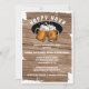 Fun happy hour invitation featuring two large beer mugs at the top and bold block lettering in white on a wood-grain design background. Easy to update and colourful enough to generate some excitement about your upcoming event!