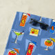 Blue colorway. This retro textile design is inspired by advertising art of the fifties. This funny pattern has tropical drinks, martinis and umbrella drinks reminiscent of the Happy Hour bars in the hotels along Waikiki Beach. Great for outdoor home decor to make your patio into a tropical lanai. This design comes in several colorways.