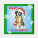Celebrate the holiday season with a cute Boxer puppy wearing a Santa hat and scarf amid snowflakes and the words, Happy Howlidays! Great holiday gift idea for Boxer-loving family and friends.