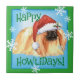 Celebrate the holiday season with a cute Pekingese wearing a Santa hat amid snowflakes and the words, Happy Howlidays! Great holiday gift idea for Peke-loving family and friends.