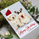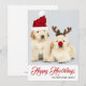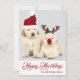 This holiday design features a photo of two Golden Retriever puppies wearing red Christmas hats and the text "Happy Howlidays" written in popular red typography with a family name added below. The back of the card has been left blank for you to add your message. To personalised you are able to add your own photo and edit the text.