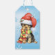 Celebrate the holiday season with a present decorated with a gift tag with a cute Yorkshire Terrier puppy wearing a Santa hat amid snowflakes! Great for giving to Yorkie-loving family and friends.