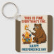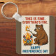 This humourous design features a distressed bear attempting to roast a marshmallow on a bonfire fuelled by fireworks, with the caption "THIS IS FINE. EVERYTHING'S FINE." Below, "HAPPY INDEPENDENCE DAY" adds a touch of ironic celebration. This graphic is perfect for those who enjoy a playful take on holiday mishaps.