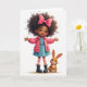 This card shows a cheerful illustrated girl and her long-eared animal friend on a plain white background, keeping all attention on their faces and body language 🐰. The girl has dark, curly hair topped with a large pink bow, and she leans forward with open arms as if welcoming a hug from her companion. She wears a bubblegum-pink jacket with shiny buttons over a soft sky-blue dress, with pink-and-white striped socks leading down to dark boots. Next to her sits a small rabbit-like creature 🐇, smiling up at her with a gentle, trusting look that suggests close friendship. Decorative swirls curl out from her hair, adding airy movement around the two figures without crowding the space. The greeting text is placed near the top in pink, with a smaller line beneath it in light blue. The background stays bright white, with the pink bow and jacket standing out most against the cool blue dress.