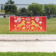 Happy Lunar New Year 2026 vinyl banner with grommets to celebrate the start of the year of the horse in the Chinese calendar. Design with gold balloon-like letters and an illustration of the animal.