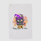 This adorable Halloween golf towel features a black cat wearing a purple witch hat alongside the playful phrase “Happy Meow-o-ween.” Perfect for cat lovers and fans of spooky season with a cute twist, this whimsical design blends Halloween magic with feline charm for a fun, festive vibe.