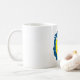 A happy yellow moon face wearing a blue and white hat. This design looks really effective on these Mug